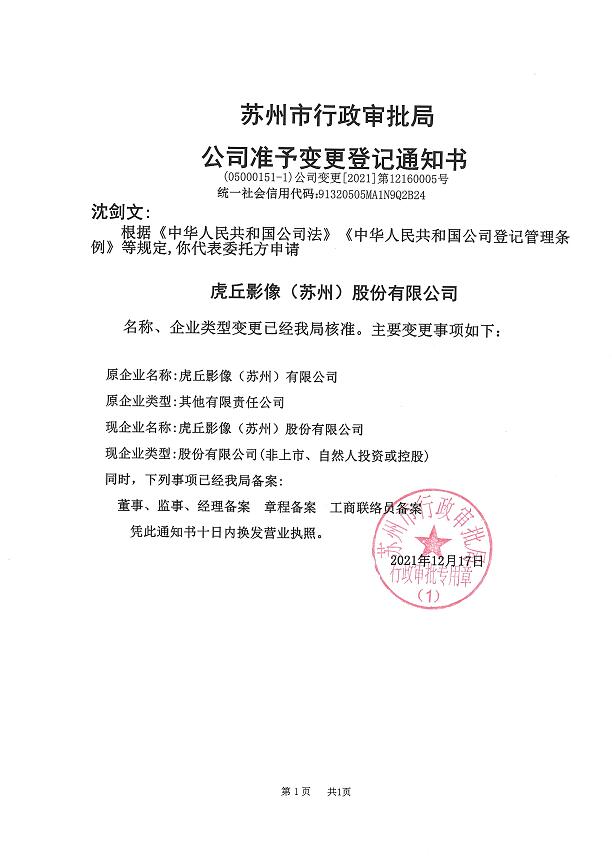 經過近半年緊鑼密鼓的工作以及上市中介機構認真嚴格的審核,虎丘影像已于近日完成了各項股改工作,除了財務審計、資產評估、驗資等法定程序外,股改后的第一次股東大會批準了股份公司新的章程和關于將公司整體變更為股份有限公司的議案,并授權新一屆董事會向工商登記部門申請股份公司的登記注冊。 12月17日,經蘇州市行政審批局核準,公司名稱正式變更為“虎丘影像(蘇州)股份有限公司”,此次變更,是虎丘影像在企業發展歷程和上市進程中又一里程碑。