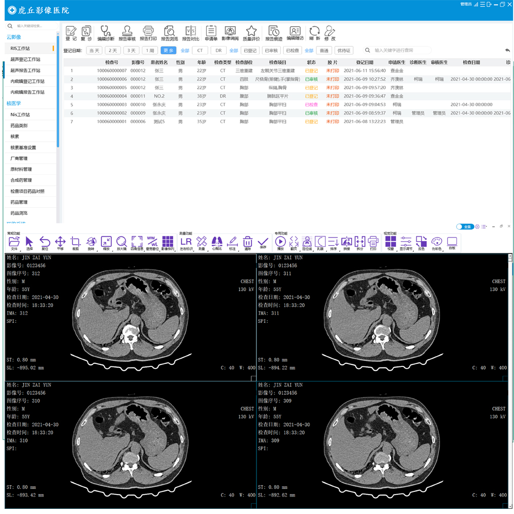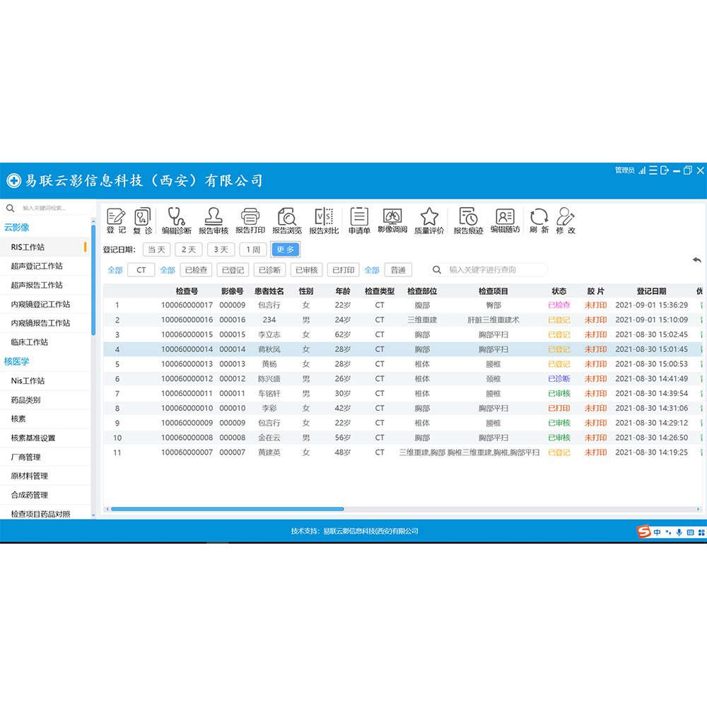 全景影像診斷,用心改變,讓診斷突破極限,賦能健康中國。滿足院內影像科室和臨床科室靈活歸檔管理和調閱影像。產品組成:登記工作站、 技師工作站、 放射診斷報告工作站、 DICOM影像處理工作站、 臨床瀏覽工作站, 刻錄備份軟件、 超聲/內窺診斷工作站、統計工作站等。